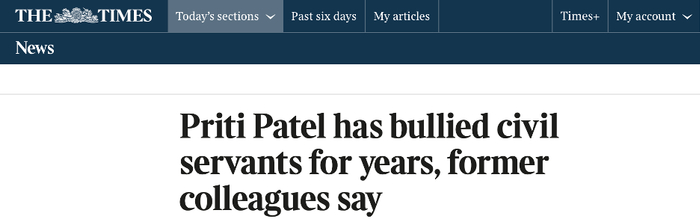 之前,《泰晤士报》报道称,英国内政部的多位消息人士指责帕特尔恃强凌弱、贬低官员、制造“恐惧气氛”。报道称,帕特尔曾试图驱逐她的常务次长路特曼爵士,这一行为构成了一种恃强凌弱的“模式”。《泰晤士报》:前同事说,普丽蒂·帕特尔多年来一直欺负公务员