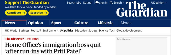 帕特尔去年7月出任内政大臣。工会方面的消息人士透露,帕特尔提出的“令人不安的”要求导致英国签证和移民管理局(UK visa and Immigration)及英国护照署(HM Passport Office)总干事Mark Thomson在帕特尔上任几周后就宣布将辞职。英国最大内政部员工工会公共与商业服务工会(PCS)的Mick Jones表示,帕特尔处理各种移民问题的方式导致了Mark Thomson的辞职。“Mark向我们的代表表示,这主要是因为他们发生了严重的争吵。很明显,[帕特尔]来了,并试图做一些他们[内政部官员]感到不舒服的事情。”政府网站上有关Mark Thomson职位的信息强调了其重要性,称:“Mark负责每年做出数百万项决定,决定谁有权访问或留在这个国家。”去年8月Mark Thomson宣布将离开英国内政部时,他给员工发了一封电子邮件,上面写道:“眼尖的人可能会注意到,我的工作岗位今天已经登广告了。我想让你们知道,在内政部工作了五年之后,我决定是时候离开了。”当时,英国内政部发表声明称,他将“因个人原因于2020年3月离职”。