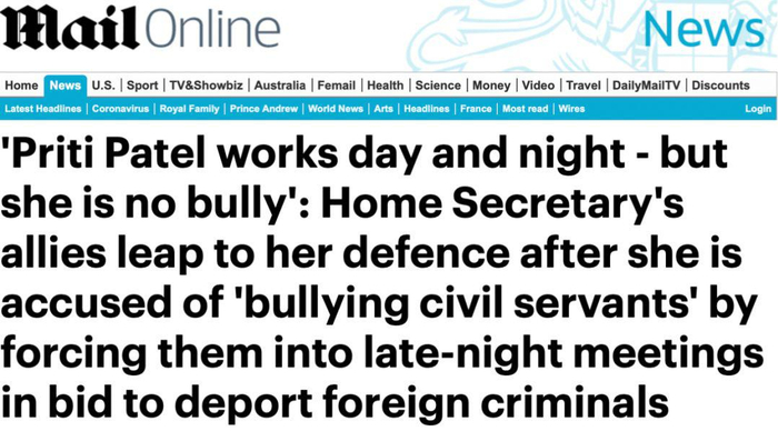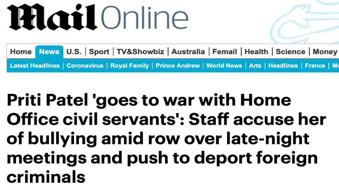 《每日邮报》:普丽蒂·帕特尔“向内政部官员宣战”:员工们指责她在深夜会议的争吵中欺凌弱小,并助推驱逐外国罪犯