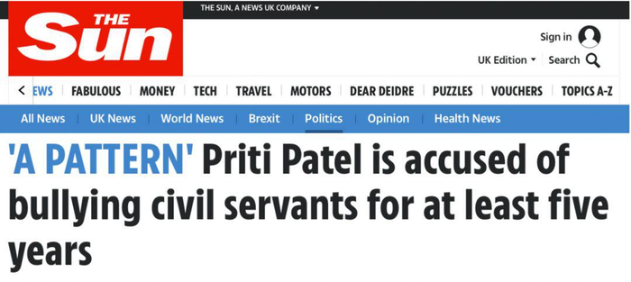 《太阳报》:普丽蒂·帕特尔被指欺凌公务员至少五年