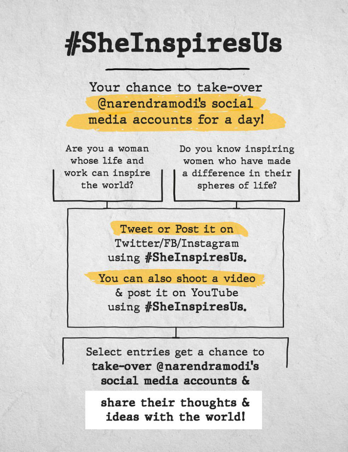3日,莫迪发布推文表示,这是一次为妇女发声的活动,并发布了活动介绍:为迎接妇女节将提前发起“她的故事激励我们”活动。所有在工作或生活上拥有鼓舞人心故事的女性,都可以带此话题在脸书/推特/Ins上发文。被幸运选中的女性,就可以在妇女节那天拥有使用莫迪社交账号发声的机会。