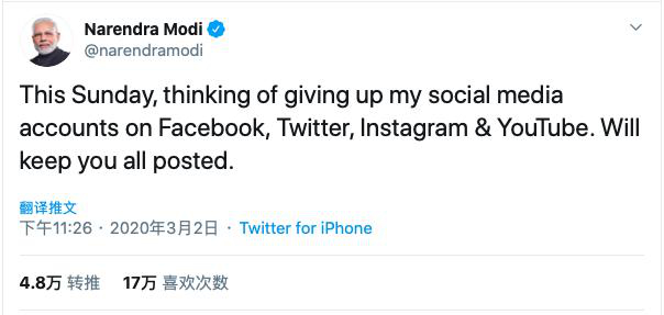 印度总理莫迪一直在社交媒体上非常活跃,他的推特账号几乎每天都会更新。但是,3月2日,他突然宣布,将在本周日(3月8日)放弃自己的社交账号,包括推特,脸书,照片墙和油管,引发媒体和网友极大的关注,大家纷纷猜测到底是什么原因,让总理“退出”社交媒体。