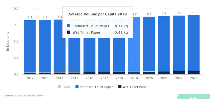 而我国虽然卫生纸总用量高于日本,但平均下来每人每年(才)用了12.6斤。