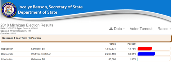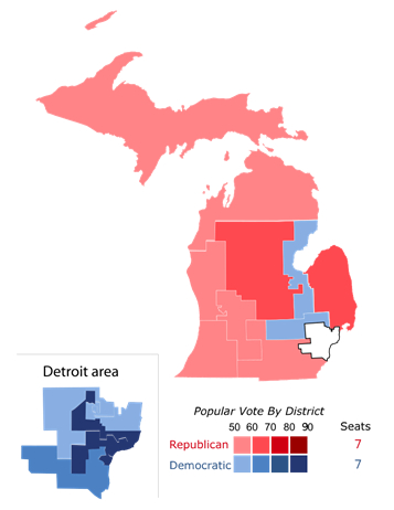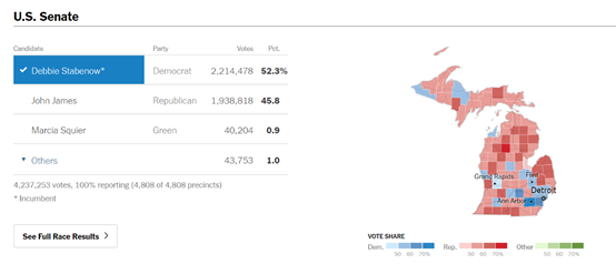 密歇根州作为“铁锈带(Rust Belt)”地区之一,历来是选举中的兵家必争之地,民主党在东南部城镇地区的优势与共和党在广大西部、北部农村地区的优势是密州政治版图的基本结构。2014与2016两个竞选周期,民主党人在密州处于不利地位,共和党籍州长Snyder在2014选举中连任成功,两届众议院选举,密州的14个席位中共和党都成功掌握9席。到了2018年,特朗普执政对美国国内社会的撕裂,让民主党在密州找到了机会,中期选举的密州民主党收获颇丰,众议院选举成功挑落两个共和党席位,两党席次变为7比7;州长选举,民主党候选人Whitmer以较大优势战胜对手;参议员Stabenow连任,保持密州参议员全取的局面。