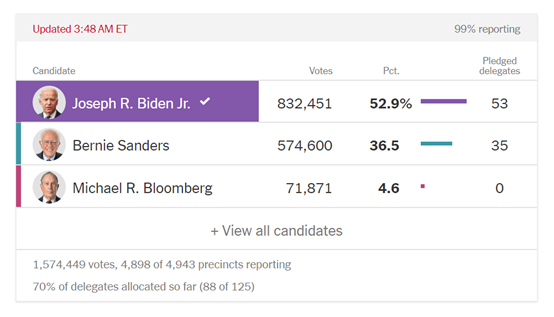 3月10日,美国民主党2020总统候选人初选在六个州展开。三月初的“超级星期二”过后,拜登逐渐确立了他在初选阶段的优势,而桑德斯则急需在其他州的竞选胜利来重新站稳脚跟,但截止美东时间3月11日凌晨,桑德斯在六个州的得票情况依然很不理想。虽然他在北达科他州以较大优势胜出,在华盛顿州的计票与拜登不相上下,但在其他州份他却未能成功。在2016年以较大优势胜出的爱达荷州,他没能延续成果,而在当日大选代表票最多的密歇根州(125席代表),桑德斯则遭遇了滑铁卢。密歇根州初选结果,拜登以超过二十万票的优势大胜桑德斯,基本验证了他之前民调预测中超过15%的优势,桑德斯获得的票数与2016年相差不大,但本届初选他不再是胜出的一方,且在州内所有县的得票,都落后于对手。