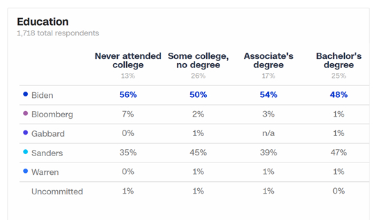 对比2016和2020两届初选的出口民调数据,不难发现,在读大学生和大学毕业生这两个占比较大的选民类别中,桑德斯在对阵希拉里时具有非常显著的优势,但四年之后面对拜登,在这两个类别他没能保持这一势头,甚至已经被拜登反超,使得按照教育程度统计的出口民调上,他全面落后于拜登。这对于桑德斯的竞选来说,足以构成极大的威胁。年轻人是桑德斯竞选活动的主要参与者,也是重要的基本盘,但这个基本盘如果不具备优势,得票状况势必受到极大影响。其二,桑德斯在2016年的胜利,一定程度上建立于蓝领工人与农村选民的投票逆转,这也是当时初选前的民调未能估计到的结果,但是四年过去,桑德斯2016年的光环也在这两个群体中逐渐褪色。