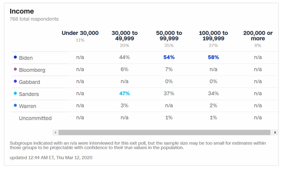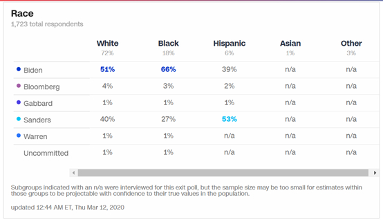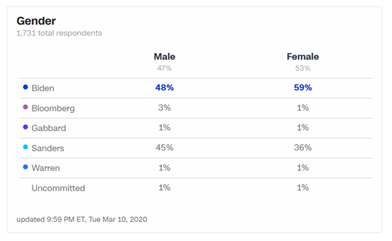 反观竞争对手,克洛布彻退选后,和早先退选的加州参议员哈莉丝(KamalaHarris)共同背书拜登,拜登在建制派的支持力量在这两位女性参议员的参与下进一步稳固,而他在女性选民中较大的优势也逐步确立下来。桑德斯在密歇根的拉票,最终并没有改变沃伦退选后其支持者的分布局面。