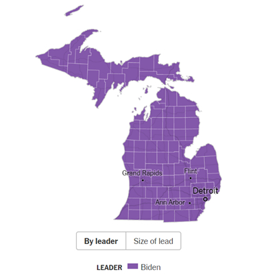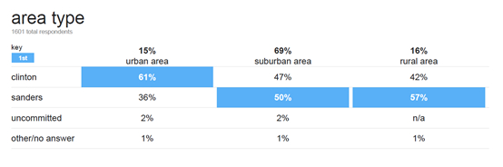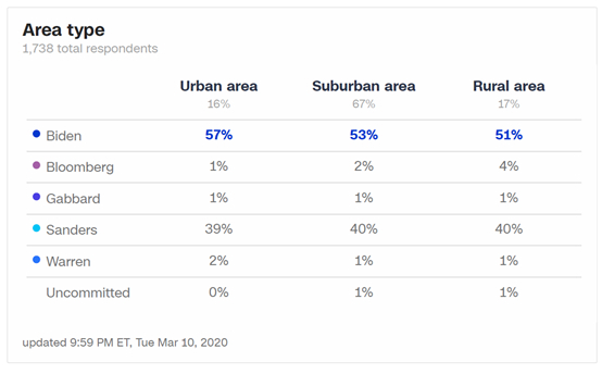 四年前,桑德斯能够吸引到的选票,如果按照收入划分,他在不同阶层上有着极大的竞争力,但本次初选,他的优势弱化了不少,不仅在较高收入的阶层上落后于拜登,甚至在他一直以来顺风顺水的较低收入人群中,他的优势也不再如对阵希拉里时显著。按收入水平统计的出口民调没有倒向桑德斯而是倾向于拜登,这意味着蓝领工人并没有跟随四年前势头,继续广泛支持桑德斯的竞选。而如果对比区域分布状况,桑德斯的退步就更加明显,在与希拉里竞争时收获的农村与城郊地区选票,如今不再是他的优势盘,拜登不仅如同四年前的希拉里一样轻松拿下东南部人口密集的城市地区,甚至更进一步,在底特律(Detroit)、大急流城(Grand Rapids)等主要城市的边缘地区,以及密歇根西部与北部的广大农村区域收获大量支持,全面击败桑德斯,如此,按县份统计得票,拜登甚至都没有给桑德斯留下一点机会,彻底翻转了四年前的投票分布。
