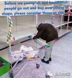 年轻力壮的朋友们,请理性购物,别过度囤货,咱们得把必需品分享给所有需要的人,尤其是老弱人群、那些“挤不过”咱们的人。在早上开门后的第一个小时里,请不要去超市吧。多谢多谢了!