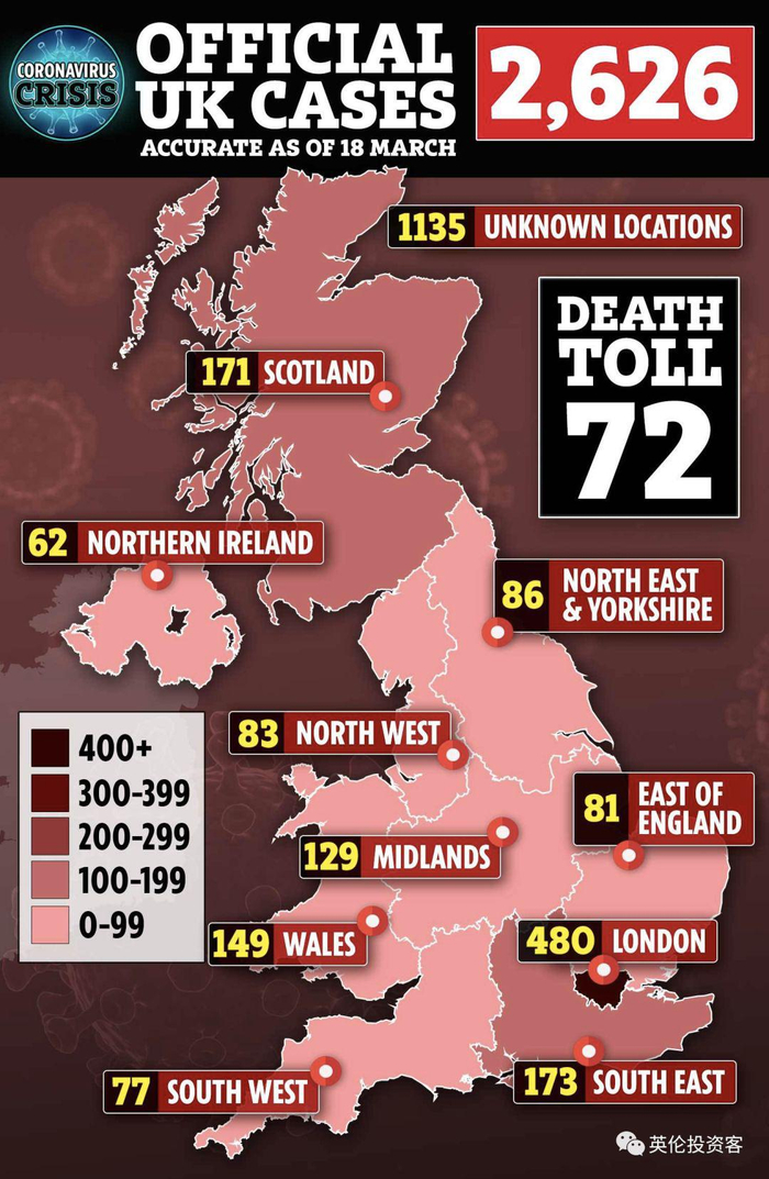 截至3月18日英国时间17点,英国累计确诊2626人,104例死亡,65例治愈。