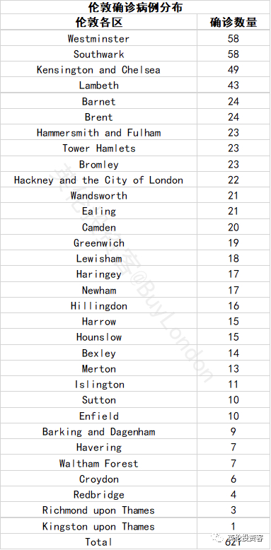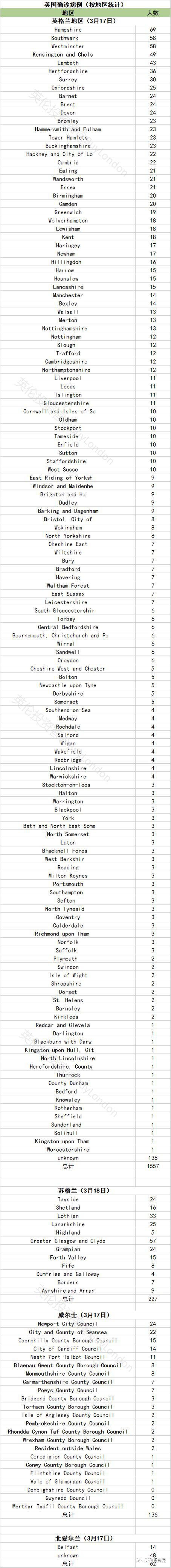 全英确诊具体地区分布如下(包括英格兰、苏格兰、威尔士、北爱),按确诊病例数排序。