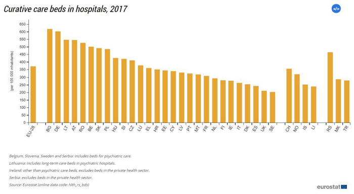 根据欧洲统计局(eurostat)2017年数据,德国在欧洲是拥有最多医疗床位的国家之一,尤其是重症床位。2017年,每10万居民就配备了601.5个重症床位。