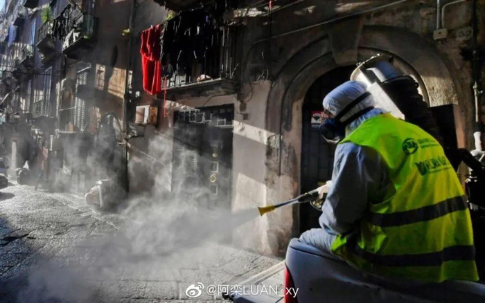 谁能想到,在我们生活的地方,某一天,也会变成这样的场景(那不勒斯正在对道路进行消毒,以防止病毒传播,图片摘要:sky tg24)。