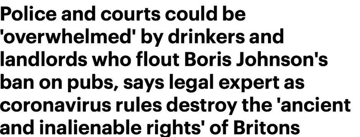 《每日邮报》报道称,新的防控措施改变英国人的传统,如果各方无视关闭酒吧的措施,那警察和法院可能会在处理相关案件上应接不暇。