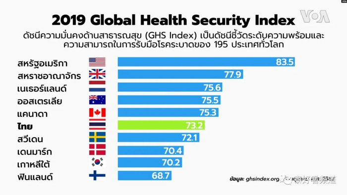不久前,2019年年底全球健康安全指数(GHS Index)排名出炉,该项数据主要通过六个类别的34个指标和85个次级指标来评估全球195个国家预防、发现和应对突发卫生事件的能力以及卫生系统的有效性。在这项排名中,泰国位列全球第6位,亚洲第一,是全球前10位当中唯一一个发展中国家。