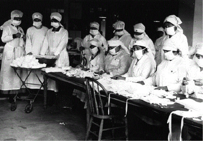 翻看美国人在1918年流感大流行期间的照片时,你会发现一个最突出的特征:口罩。白色纱布裁制而成的口罩几乎覆盖了每一张脸。