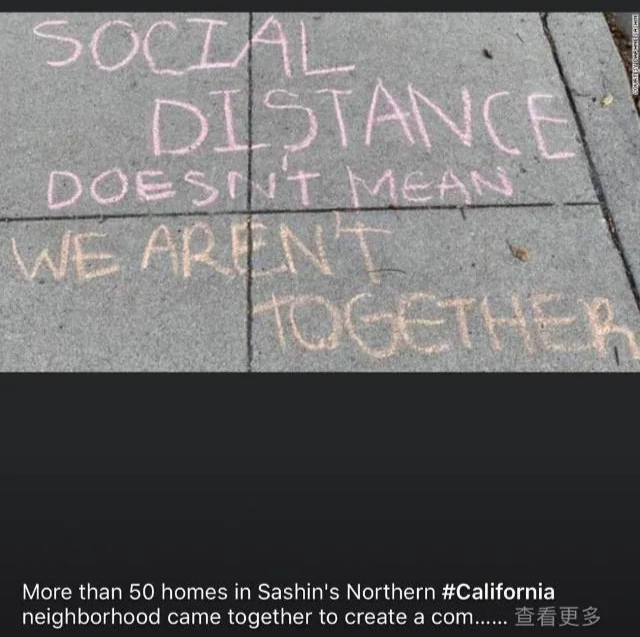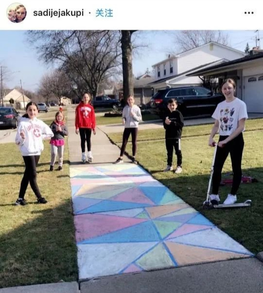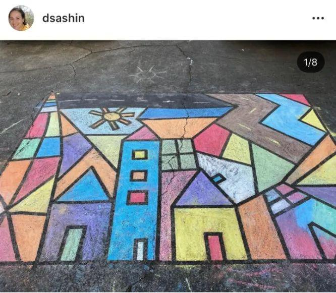 无独有偶,一位加利福尼亚的母亲的创意与手绘彩虹不谋而合。Daphne Sashin为了让孩子寻找居家隔离期间的乐趣,在邻居群里提议用粉笔在人行道或车行道上画画,经过讨论在群里制定了计划让每户人家特定区域完成一幅绘图,这样既可以避免密切接触,又在隐隐中实现了互动。Daphne Sashin说如果这项活动能够延续下去,成为社区的一项传统。艺术点亮生活,在这一倍感压力的时期显得恰如其分。