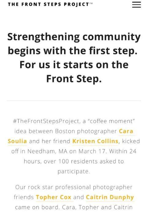 疫情笼罩下,不少家庭在经历恐慌的同时,因没法与亲友详见而倍感孤独。为了给这一困难的时期增添乐趣,马赛诸塞州的摄影师Cara Soulia和Kristen Collins站了出来,发起名为Front Steps的项目。每天,他们花上几小时的时间挨家挨户敲门,为住户在门前拍家庭合照,住户们往往十分激动,尤其是孩子们,因为这满足了他们的社交需求。