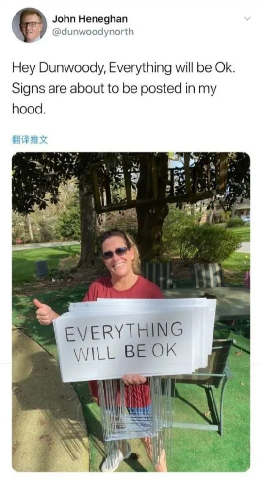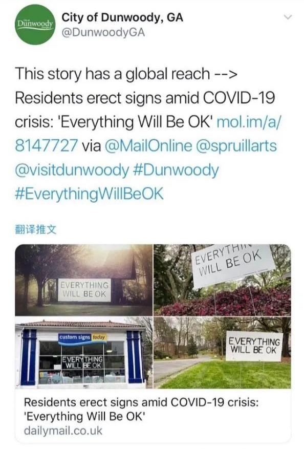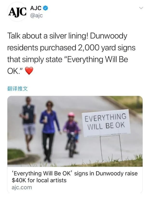 佐治亚州的Dunwoody小镇,所有居民都在接受自我隔离。为了鼓励社区民众,当地一家名为Create Dunwoody的致力于公共艺术的组织以20美元的售价向居民分发“一切都会安好”的标牌,住户们也可选择网上下单,由工作人员以无接触的方式将招牌插在庭院内。此举得到了社区居民的大力支持,家家户户门前竖起了“Everything will be OK”,无形中连结起了这个完全处在封闭状态的住宅区。很快,Dunwoody的创意得到了其他社区的相应,这场Everything will be OK的爱心接力已经走出佐治亚州,鼓励更多的人勇往直前。