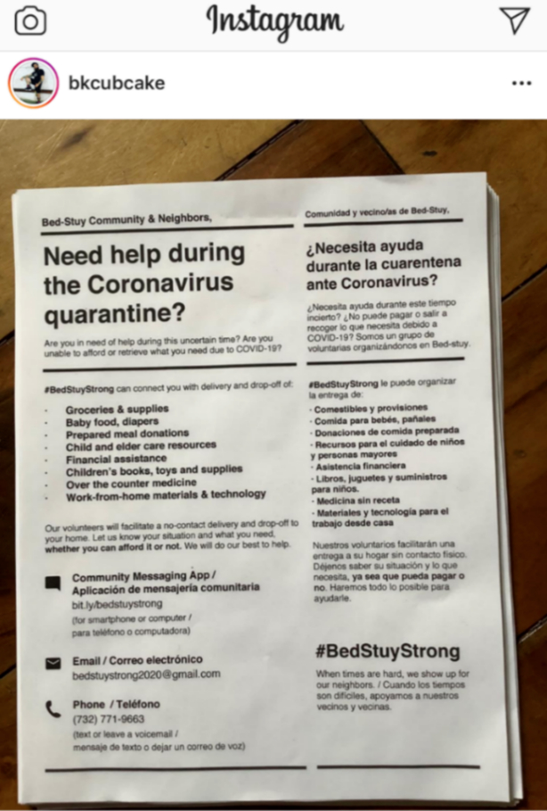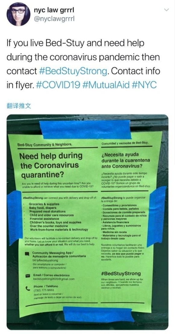 纽约是美国目前疫情最严重的城市。在布鲁克林的老年人聚集区贝德福-斯都维森,由于担心纽约封城会影响日常采购,29岁的侦探小说家莎拉·马修斯发起了一项扶持项目,居民在社交平台Slack上组织起了代买食材服务。因疫情失业的人和行动不便的老人只要提供购物清单就有社区志愿者送货上门,不收取任何费用。其他人也可以提出购买需求,任何人都能加入志愿者队伍。考虑到一些人没有智能手机或存在语言障碍,志愿者在居民楼张贴了纸质版的告示,只要拨打热线便能提出诉求。这场活动中折射出了无处不在的邻里互助,原先在H&M做收银员的罗德里格兹因疫情失去了工作,她只得暂时让邻居代付宽带费,与此同时自己担任起志愿者的工作。