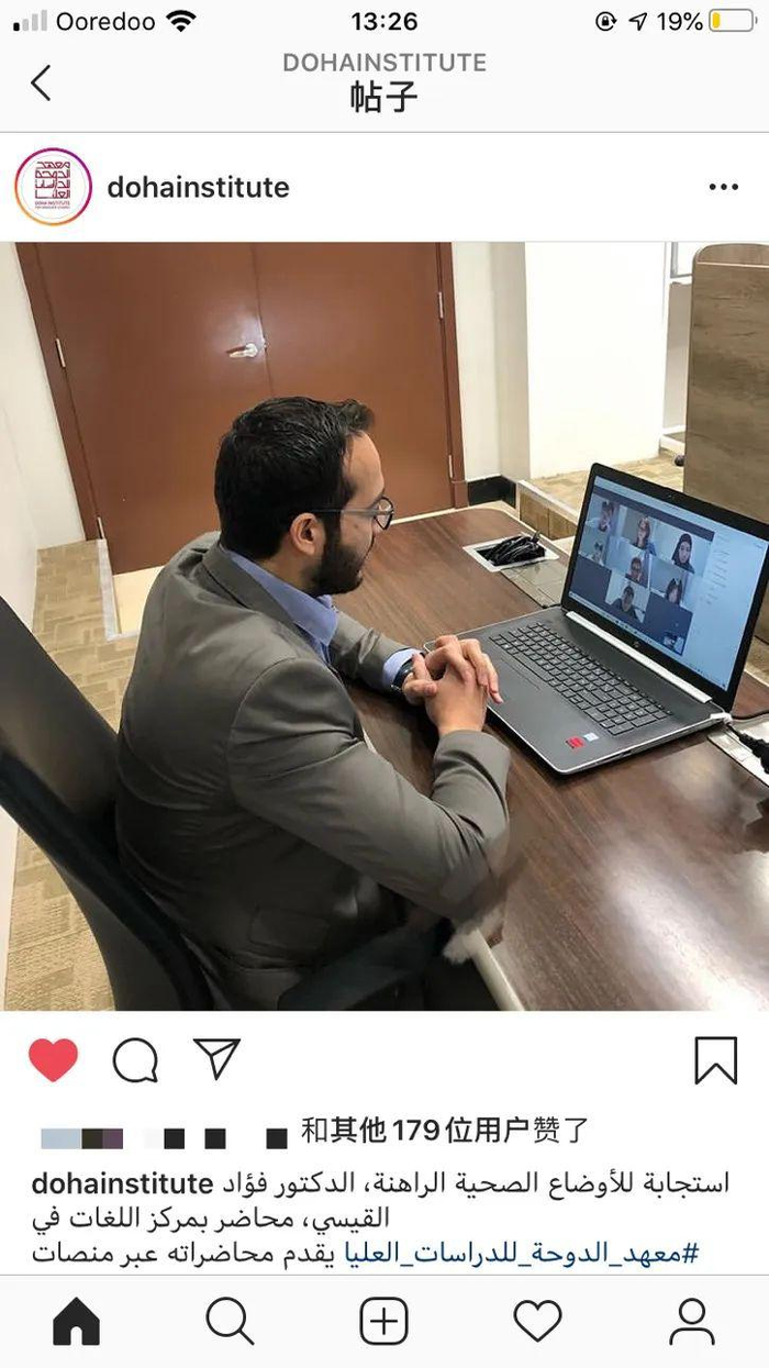3月11日周三,我们开始了在研院的第一节网课。在原来的安排下,这节课应该是同学们做presentation,于是老师让我们在前一天晚上将ppt发给他,第二天同学们pre时老师可以投屏放映大家的ppt。第一节课进行得还算顺利,所有同学做完展示老师进行点评,不知不觉三个小时就过去了。可能是还不习惯网络授课的方式,听老师讲话时总觉得很吃力,本来略显薄弱的阿语听力在快语速输出和网络输送下变得有些捉襟见肘。中午一起吃饭时,来自德国的同学也和我们倾诉,说这种方式让她很不适应,大家的互动减少了很多。