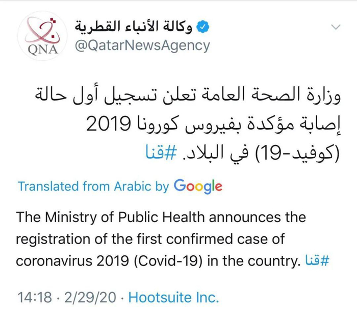 2月29日:卡塔尔公共卫生部确诊卡塔尔首例新型冠状病毒肺炎病例。