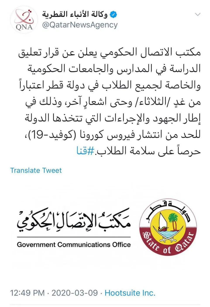 3月12日:卡塔尔政府宣布关闭所有电影院、博物馆、剧院、儿童游乐场、健身房等娱乐场所。