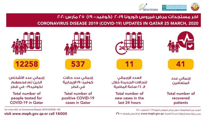 3月25日:过去9天,卡塔尔新增新冠肺炎病例98例,新增治愈41例,疫情增长态势得到一定控制。