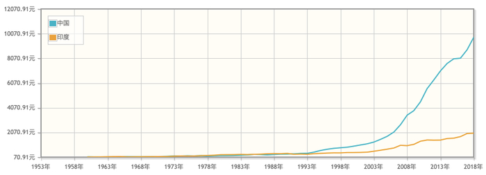 印度现在的人均 GDP 只有中国的 1/4。但是如果回顾一下历史,你会大吃一惊。1978 年改革开放之初,中国的人均 GDP(156 美元)比印度(205 美元)还低,直到 1991 年中国才第一次超越印度。从此,一发不可收拾,龙象渐行渐远。