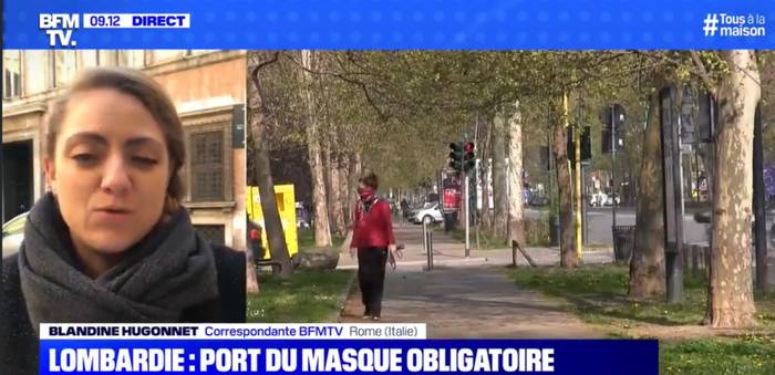 ▲意大利伦巴第大区街头有人戴口罩、有人捂着围巾、也有人“裸”着。(法国BFM电视台截图)