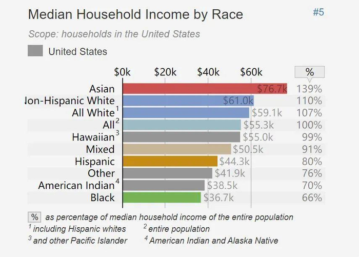 在美国家庭收入大于20万美元的高收入阶层中,白人占81%,亚裔占9%,其他族裔合计才10%,而拉丁裔加黑人的总人口比例接近30%。而在低于1万美元的最低收入人群中,黑人却占25%,远高于其人口比例。如果强行把人口拉平,则发现黑人的贫困发生率接近白人的3倍,拉丁裔的贫困发生率相当于白人的1.5倍,而亚裔依然是美国最富裕的群体,在高收入组中甚至会达到白人的1.7倍(假设人口相同)。