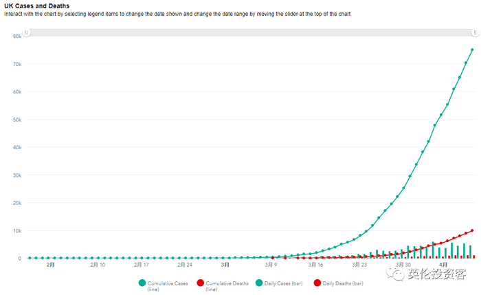 最后附上刚刚更新的疫情图表,包括英国病例增长、地区分布。英国确诊和死亡数据图,确诊逼近8万,即将超过中国的确诊数(8.3万)