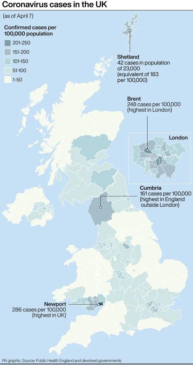 可以看到,除了排名第一的威尔士Newport,另外排名前列的地区都位于伦敦。伦敦之外,还有以下几个地区疫情相对严重,分别是Cumbria(161)、谢菲尔德(152)、Walsall(136)。二。 玩游戏、看电影,首相病情持续好转下面再说一下英国首相鲍里斯的最新病况。昨天我们报道了鲍里斯转出ICU后,已经可以下床走路。而据今天英国首相府发言人的最新消息,英国首相鲍里斯在康复期间没有工作,主要靠玩游戏和看电影打发时间。