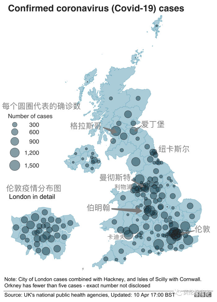 上图为BBC根据截至4月10日的英国确诊数据,绘制的疫情分布图,最大的圆圈代表确诊1500或以上的地区,然后依次是1200、900、600、300。为了让大家看的更清楚,我在图上标出了英国几个大城市的位置。
