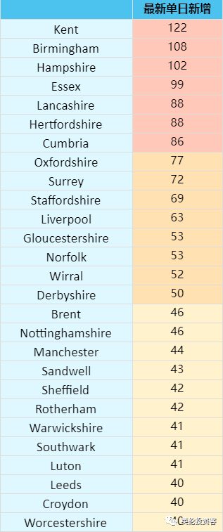 过去24小时,英格兰地区单日新增确诊排名前三:肯特(+122);伯明翰(+108);Hampshire(+102)