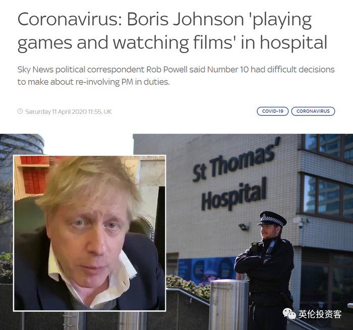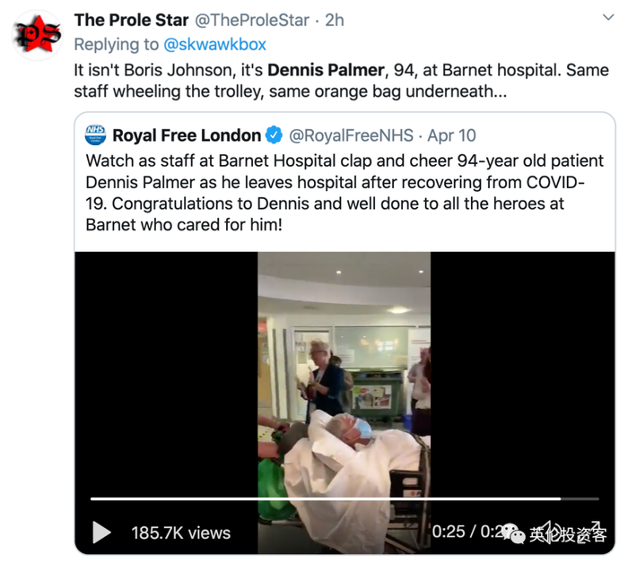 另值得一提的是,在鲍里斯转出ICU后,今天有一段视频在国内传播地很广。这个视频一度被认为是鲍里斯转出ICU当时的现场实况,但随着便被网友纠正,指出这位病人是一名叫Dennis Palmer的94岁老人,并非首相鲍里斯。