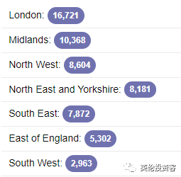 英国英格兰地区确诊分布,伦敦确诊16,721,伯明翰所在的Midlands确诊10,368
