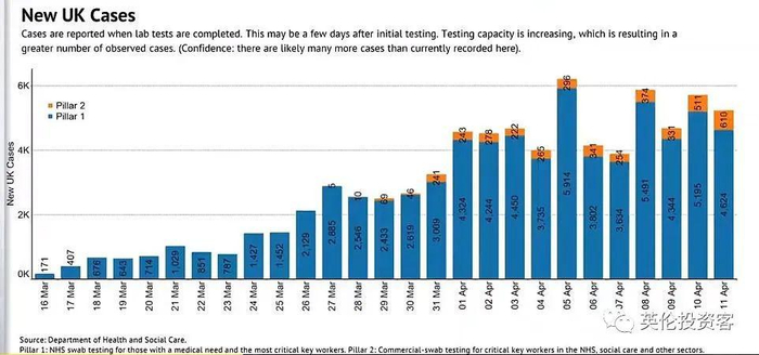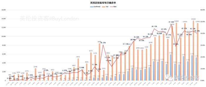 英国累计死亡逼近1万,更多重疫区曝光。先说数据。过去24小时,英国新增确诊5234例,新增检测12993人,确诊率40.2%。英国每日确诊走势