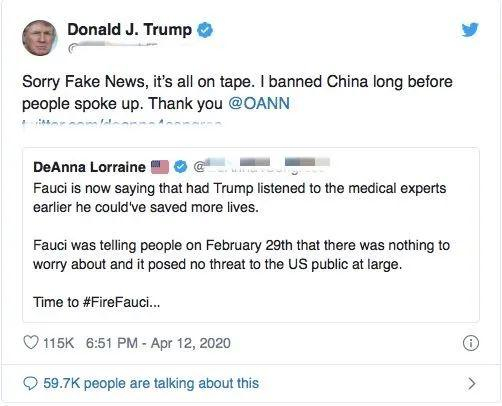 一位共和党前众议院参选人在推特上发文称:福奇现在说,如果特朗普早点听医学专家的建议,本来可以挽救更多生命,但是福奇2月29日还告诉美国公众,没有什么可担心的,新冠病毒对美国公众不构成威胁。是时候解雇福奇了。#FireFauci#而这条推文被大统领转发了!转发语是:不好意思啊,假新闻,这些都录下来的,我在人们张嘴前颁发了中国禁令。谢谢@OANN(特朗普最喜爱的右翼媒体)