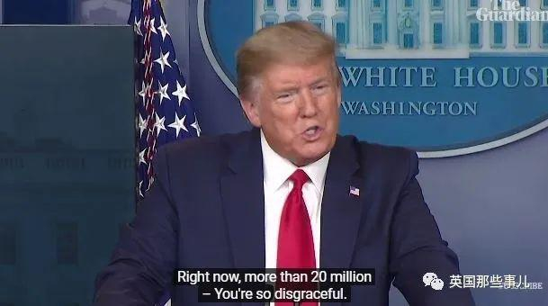 记者B:“……2000万人失业,这个时间卷轴是怎么让人们在一个前所未有的危机中还能充满信心的呢?”川普:“你说话的方式是真的不要脸,我刚刚说过了!当没人觉得应该这么做的时候,我做了。”记者B:“你在争取来的时间里做什么了?在2月份,那个视频里是完全的空白。”川普(非常不爽地):“在美国完全没有病例的时候……”记者B:“在旅行禁令为你争取的2月,你们当局都做了什么?!”川普(咆哮):“很多事情!很多!!!我们做了很多,视频上只是一部分。”
