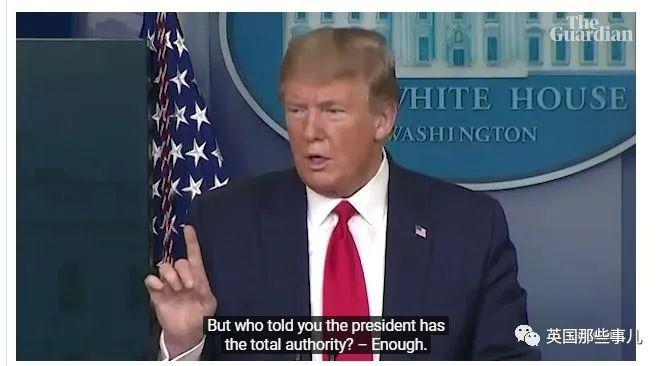 但是请注意:川普这个主张其实是不正确的。虽然行政部门在紧急情况下拥有某些有局限性的权力,但美国宪法将各个辖区的公共健康和安全责任主要赋予了各州和地方官员。所以,这个推特是漏洞百出的……因此在简报会上有媒体对此提出质疑,然后,又又又把川普给逼急了,开始狂怼记者。记者E:“你有什么权力?”川普:“我有最终权力……美国总统有着美国总统的权力,非常强大,负责做主。”
