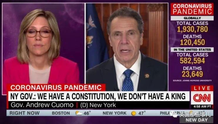 这个事情的起因,是目前有些州的疫情区域稳定,州长们开始谨慎的讨论是否需要放松封锁。而川普与包括纽约州州长Andrew Cuomo在内的州长们就“谁有最终决定权”产生分歧。川普认为,他对国家何时重新开放拥有“全部”的权力。为此还发了俩推……“为了制造冲突和混乱,一些假新闻媒体说,开放州是州长的决定,而不是美国总统和联邦政府的决定。大家要意识到,这是不正确的。”“这是总统的决策,而且有很多很好的理由。不过话虽这么说,我和我的政府还是正在与州长紧密合作,并且将继续合作下去。我将与州长在其他人的支持下共同做出决定,很快做出决定!”