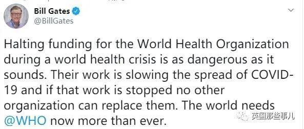 比尔盖茨:“在世界卫生危机期间停止为世界卫生组织提供资金和听上去一样危险。他们的工作减慢了新冠病毒的传播速度,如果他们不做也没有任何组织可以取代他们。世界现在比以往任何时候都更需要WHO。”
