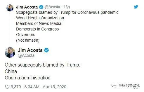 CNN白宫通讯员Jim Acosta还说,川普新冠疫情的替罪羊:WHO,新闻媒体,民主党人,州长,中国,奥巴马政府。(除了他自己)