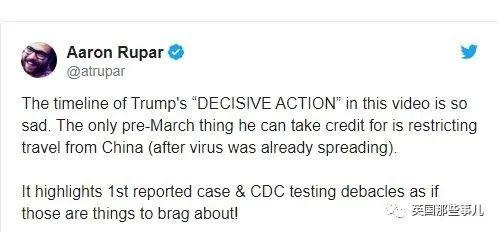 有记者就直接在网络上吐槽了……“这段视频里川普‘决定性行动’的时间表真让人难过。他的三月之前唯一值得称赞的活动就是限制来自中国的旅行(还是在病毒已经传播之后弄的)。它强调了第一例确诊和CDC测试的崩溃,好像这是什么值得炫耀的事情似的!”