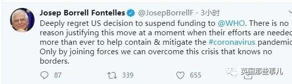传染病医生,波士顿大学医学院副教授Nahid Bhadelia博士说,停止资金是“绝对的灾难“。欧盟高级代表Josep Borrell Fontelles:“对美国暂停向WHO资助的决定深表遗憾。在这个比以往任何时候都更需要WHO的努力来帮助遏制和减轻疫情的时候,没有理由为这一举动辩护。只有团结起来,我们才能克服这一无国界的危机。”