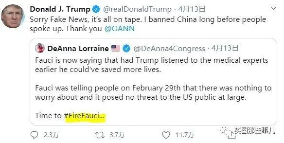 没想到,采访结束没多久,川普就转发了一位前国会议员参选人发的推,推里说Fauci说话前后矛盾,还说“是时候炒掉Fauci了”。川普不仅转发了,还加了一句:“不好意思假新闻们,所有一切都有录音。我在有人建议之前就禁止了中国来的航班。”