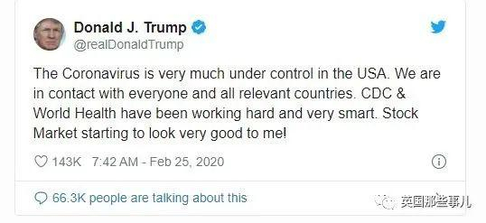 但是很明显,没什么效果。因为川普在2月25日还在发推特自鸣得意,“新冠在美国被控制的非常好。”