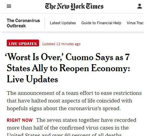 挑头的就是纽约州州长科莫,他认为现在“解封”还没到时候,疫情仍然很严重,而且白宫依旧没有给各个州有力的支持。而在这种情况下,白宫不正视疫情传播的风险,发布了任何命令以重新开放纽约州,并重新启动纽约州的经济,都是不能接受的。