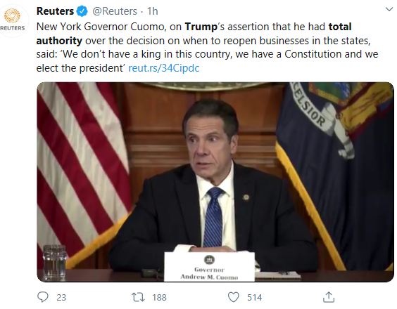4月14日,特朗普在推特上写道:“科莫每天,甚至每小时都打来电话求我,其中很大部分应该是州的责任,比如新的医院、床位、呼吸机等。我全都帮他搞定了,现在他似乎想闹独立!那不可能!”